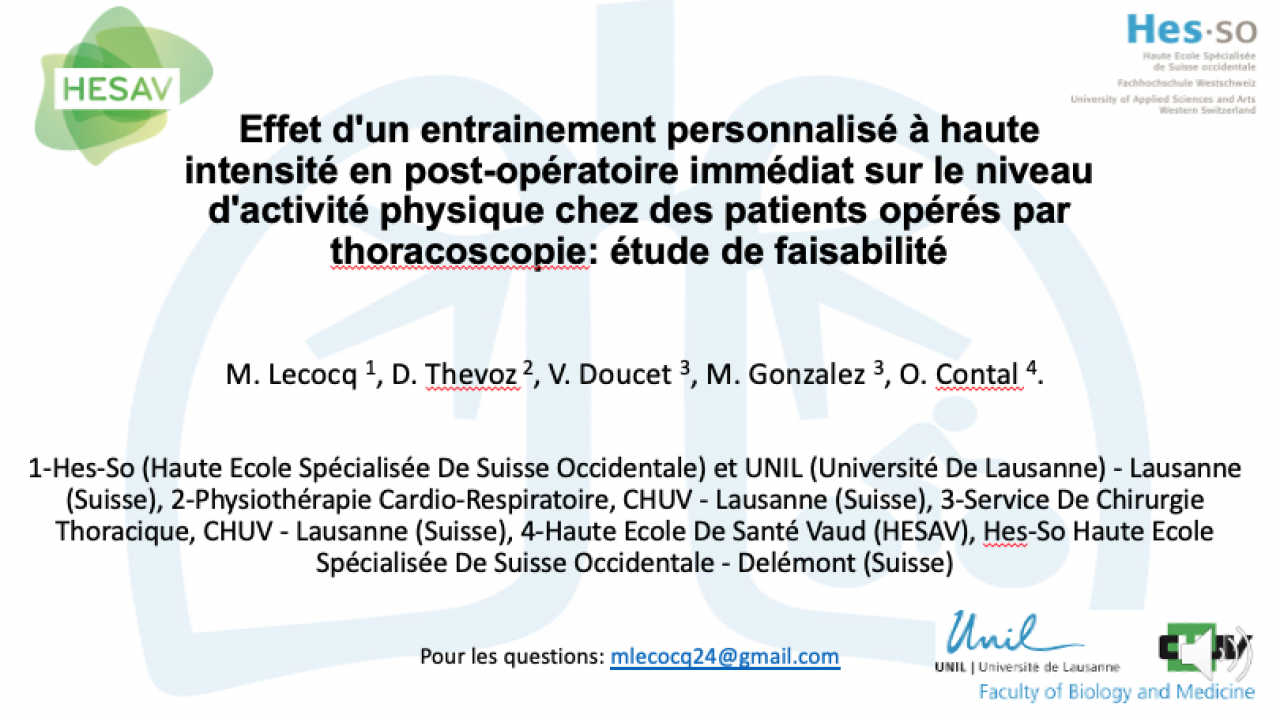 Exe-4 - Effet d'un entrainement personnalisé à haute intensité en post-opératoire immédiat sur le niveau d'activité physique chez des patients opérés par thoracoscopie: étude de faisabilité