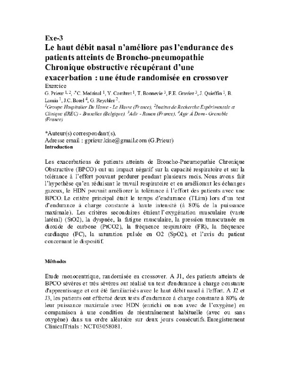 Exe-3 Le haut débit nasal n'améliore pas l'endurance des patients atteints de Broncho-pneumopathie Chronique obstructive récupérant d'une exacerbation : une étude randomisée en crossover