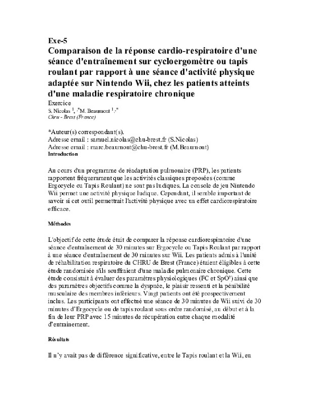 Exe-5 - Comparaison de la réponse cardio-respiratoire d'une séance d'entraînement sur cycloergomètre ou tapis roulant par rapport à une séance d'activité physique adaptée sur Nintendo Wii, chez les patients atteints d'une maladie respiratoire chronique